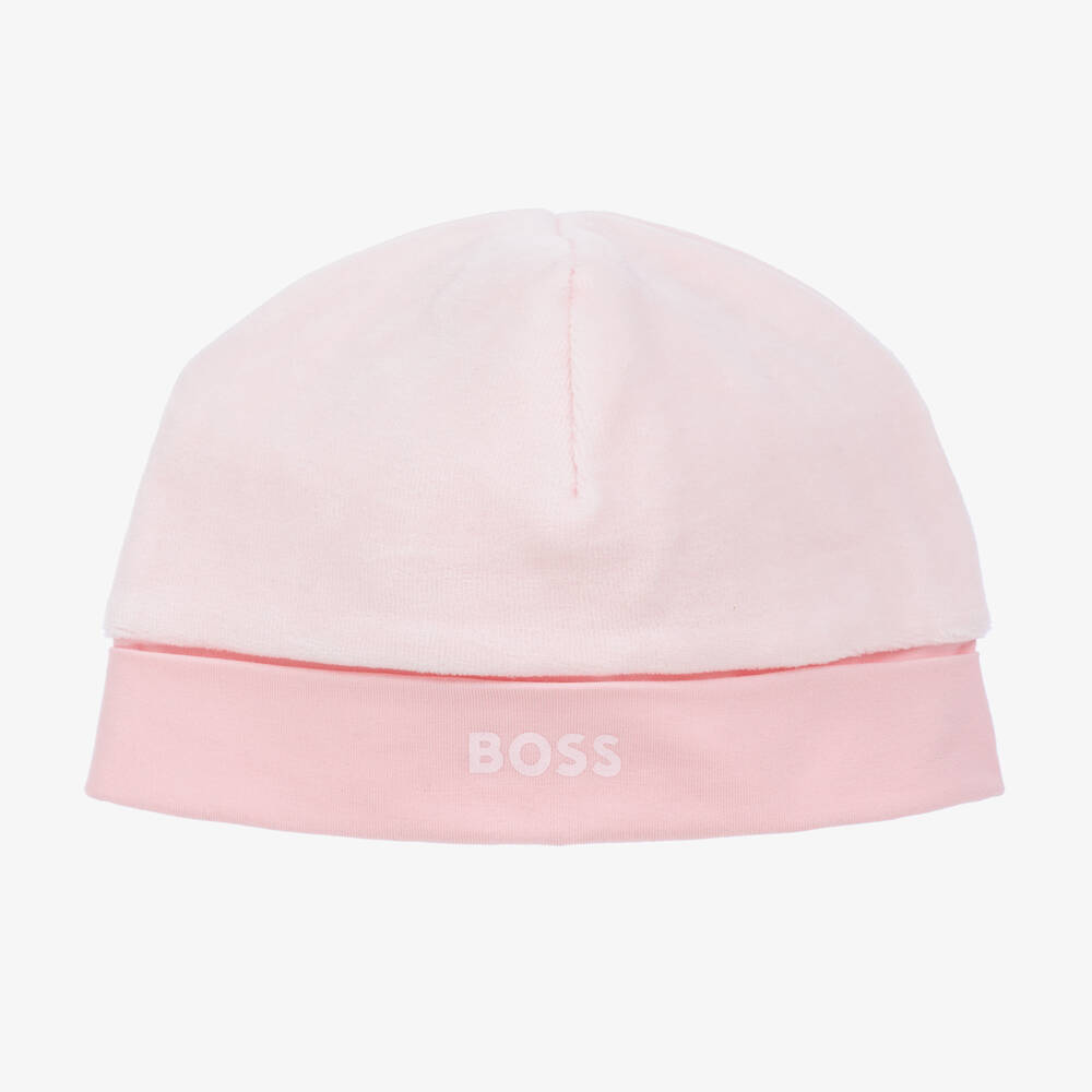 Pale pink organic cotton hat for baby girls by BOSS, made in soft and cosy velour. The comfortable jersey lining and turned up brim are in contrasting pink, with the designer's logo printed on the front for a branded finish.