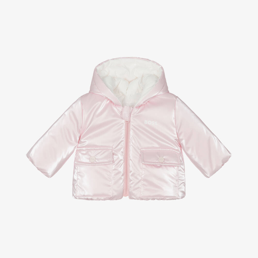 Useful, water repellent, reversible jacket for baby girls by BOSS, with a shiny, pale pink side and a matt, white side. Ideal for chilly days, it has a cosy, fixed hood and warm padding, with a gently elasticated hemline and cuffs to keep the cold out. For an instantly recognisable look, both sides have the designer's logo printed on the front, with branded popper and zip fastenings. There are flap pockets on the pink side.