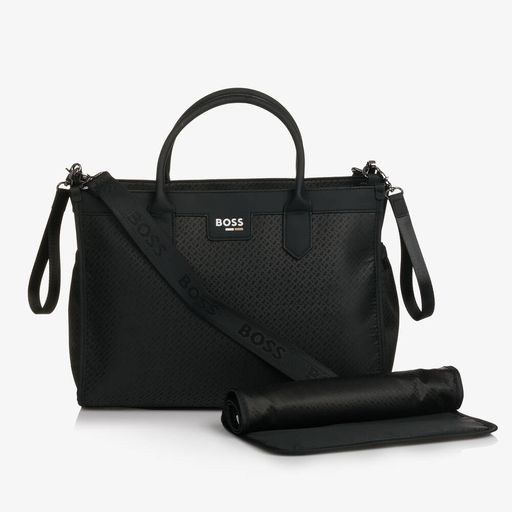Inspired by the adult collection, this stylish black changing bag by BOSS features the German brand's monogram logo pattern. For added designer appeal, there is a white logo print and signature stripes on one side and the adjustable jacquard shoulder strap is woven with repeat logos. The spacious main compartment has a silky lining, mesh pockets and a zip fastening. There are further convenient external pockets, ideal for organising belongings. For versatile carry options, it has fixed handles on the top and detachable, clip-fastening stroller straps. It comes with a matching, padded changing mat for outings.