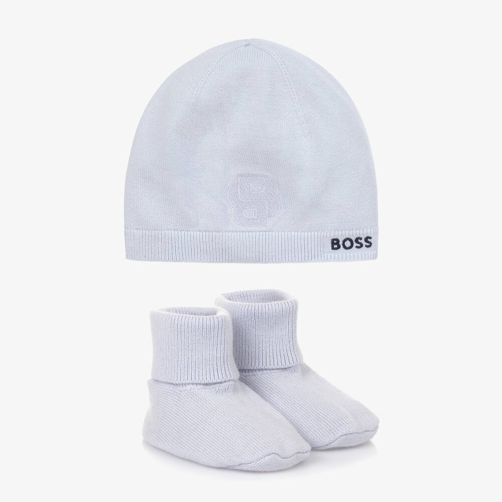 Powder blue knitted hat and booties set for baby boys and girls by BOSS, luxuriously presented in a gift box. Knitted in fine cotton, each piece in this set is delicately accented with subtle designer details.