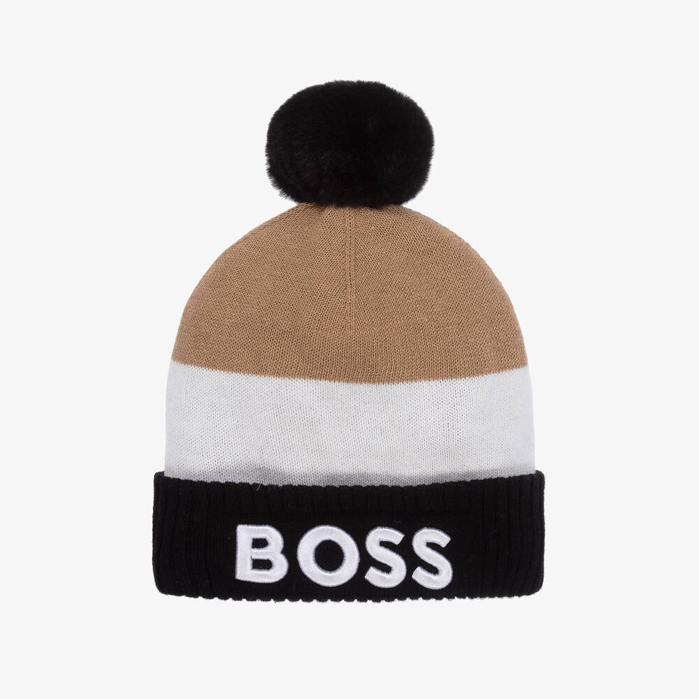 Instantly recognisable, this cosy hat for younger boys by BOSS, is striped in the brand's signature shades of beige, white and black. Knitted in soft cotton, it has a soft fleece lining for extra warmth and a cute pom-pom on the top. A bold white logo is appliquéd on the turn-up brim for designer appeal.