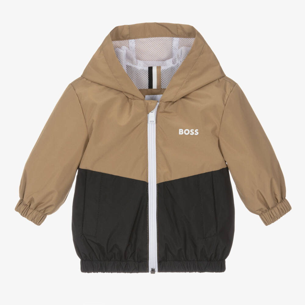 A beige and black windbreaker jacket for little boys by BOSS, printed with a white logo on the chest. Smooth and water repellent, this hooded jacket has slanted pockets on the front and elasticated cuffs and hem for a comfortable fit. It is lined in lightweight mesh, with a zip fastening and protective chin guard.