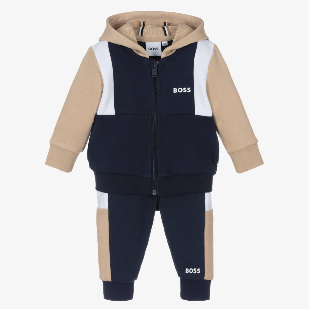 In navy blue, beige and white, this sporty tracksuit for little boys is by BOSS. Made in comfortable cotton jersey, both pieces have signature white logo prints and useful pockets. The zip-up top is trimmed with the brand's tricolour stripes inside the hood, and the trousers have an elasticated drawstring waist for an ideal fit.