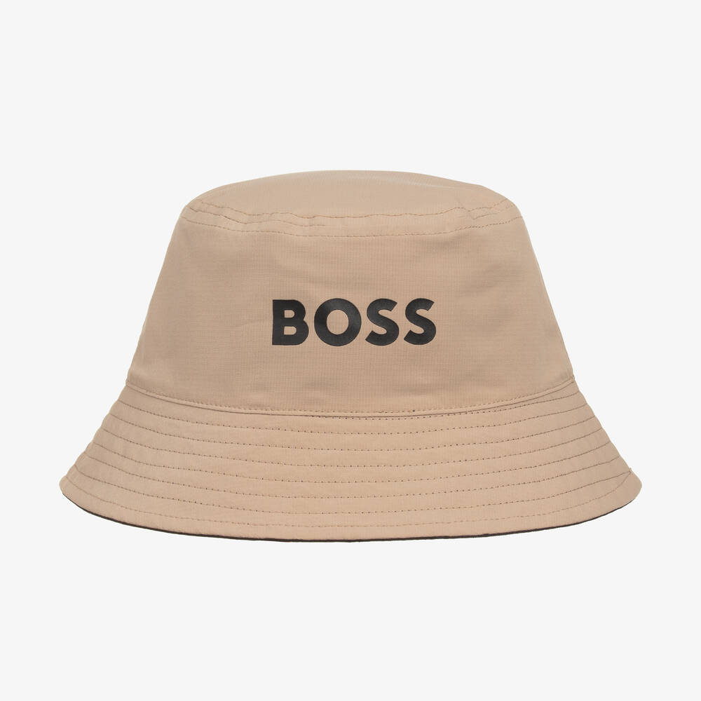Reversible bucket hat for boys by BOSS, in versatile beige and dark navy blue shades. The beige side is made in durable ripstop fabric with a black logo print and the reverse is made in twill with a contrasting white logo.
