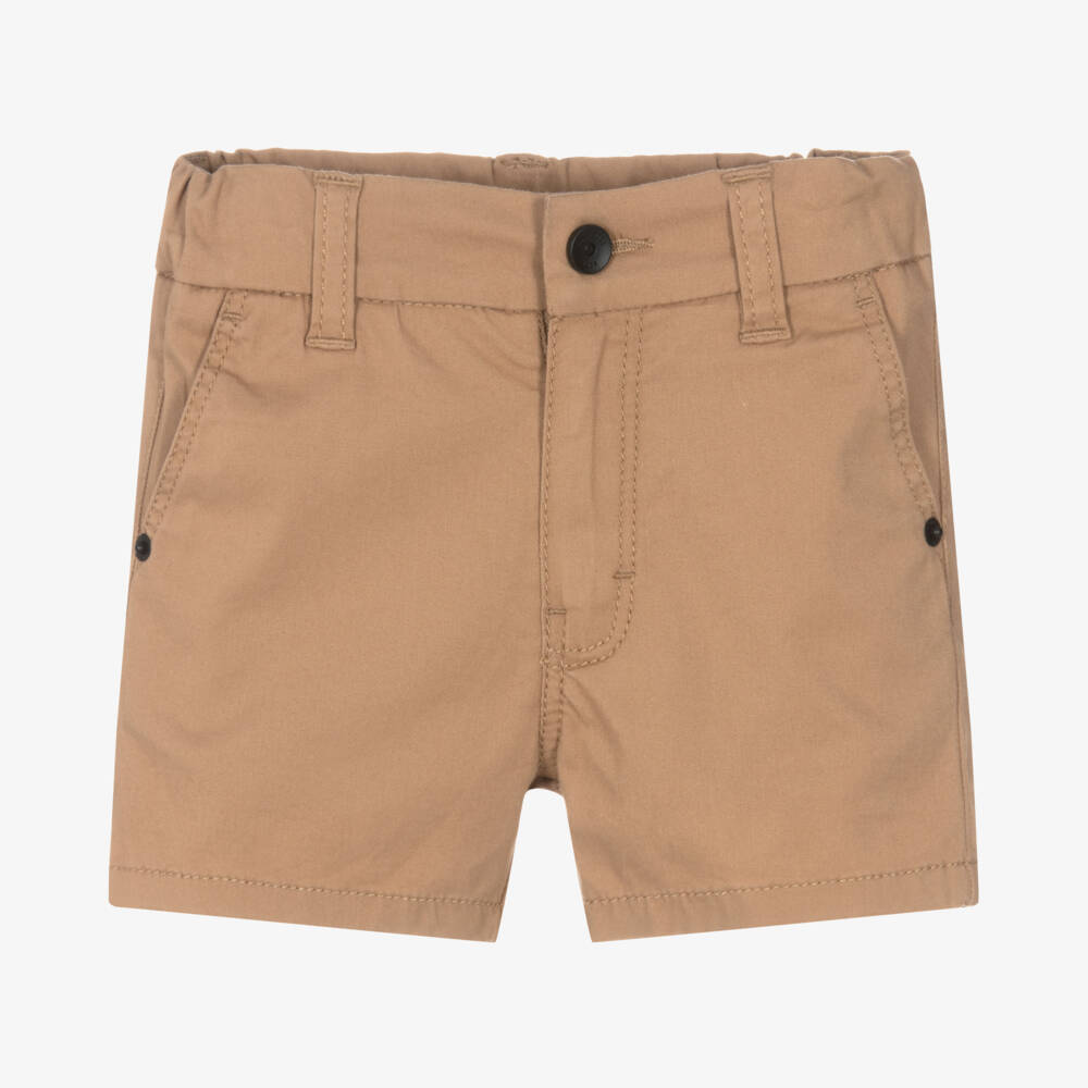 Dark beige chino shorts for little boys by BOSS, made in soft cotton twill with added stretch for comfort. With a useful adjustable waist, these classic shorts have four pockets and a striped tab on the back. They fasten easily with a zip, hook and eye.