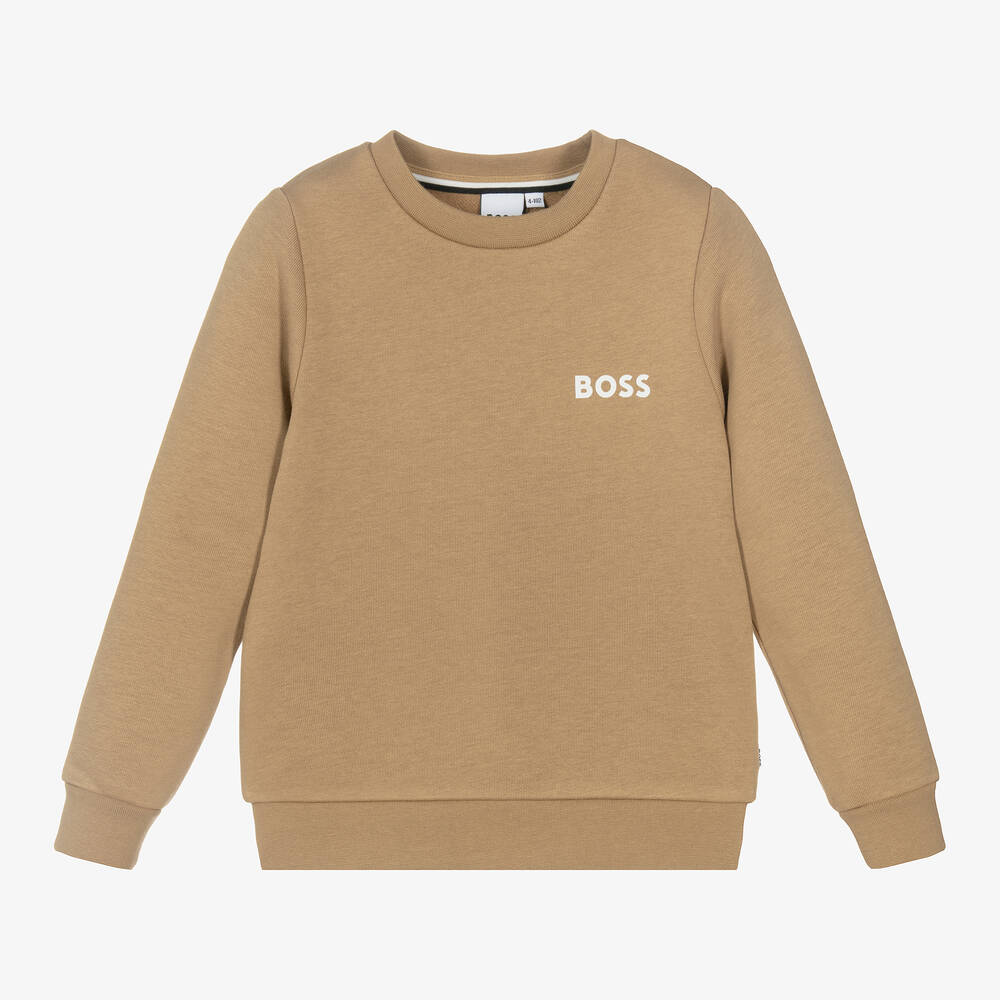 A Mini-me dark beige sweatshirt for boys by BOSS, made in a cotton blend jersey with a super soft fleecy inside. A white logo on the chest and a signature trim inside the ribbed crew neck add a contemporary designer look to this effortlessly casual style.