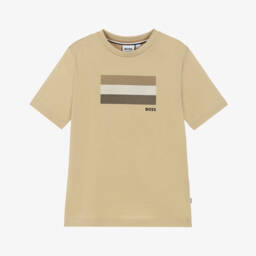 Beige Mini-me T-shirt for boys by BOSS, made in soft, comfortable, cotton jersey. This casual tee has a cool striped design of the label's signature tricolours on the front, with a black logo below and a tricolour trim on the back of the neck for a final designer flourish.