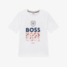 White with black and beige stripes, this casual T-shirt for little boys is by BOSS. Made in comfortable cotton jersey, it has shoulder poppers to help with dressing. A logo print on the chest and a branded tab at the side seam add a signature finish.