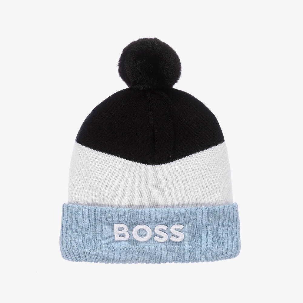 Instantly recognisable, this cosy hat for younger boys by BOSS, is striped in shades of black, white and blue. Knitted in soft cotton, it has a soft fleece lining for extra warmth and a cute pom-pom on the top. A bold white logo is appliquéd on the turn-up brim for designer appeal.