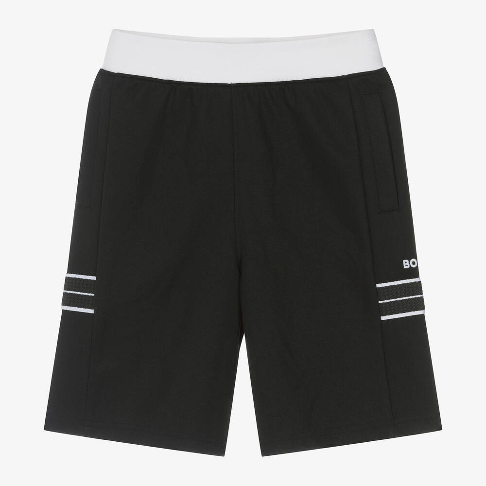 Black shorts for boys by BOSS, made in silky smooth cotton-blend jersey for comfortable wear. This sporty design has braided taped trims on both legs, with white logo embroidery adding designer appeal. They have useful pockets on the front and a stretchy, white elasticated waistband for cool contrast.