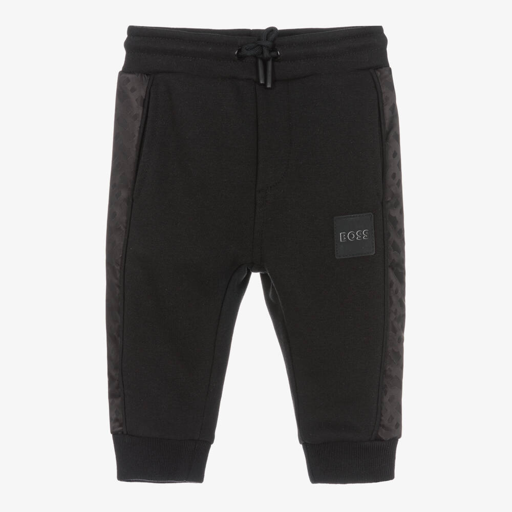 Mini-me black joggers for little boys by BOSS, made in a soft mid-weight cotton-blend jersey. Casual and comfortable, they have side seam pockets, stretchy ribbed cuffs and an elasticated waistband with drawstring ties for an adjustable fit. For a distinctive look, they have silky side panels patterned in the designer's tonal Monogram logo, with a branded logo patch on one leg completing the designer look.