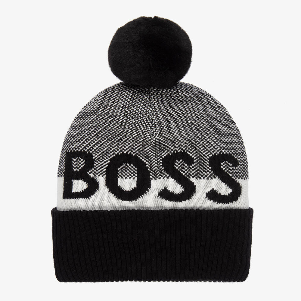 Black and white bobble hat for boys by BOSS, knitted in soft cotton. It has a ribbed, turned-up brim and a cosy polar fleece lining for added warmth. There is a large black intarsia logo across the front and a soft, plush pom-pom on the top.