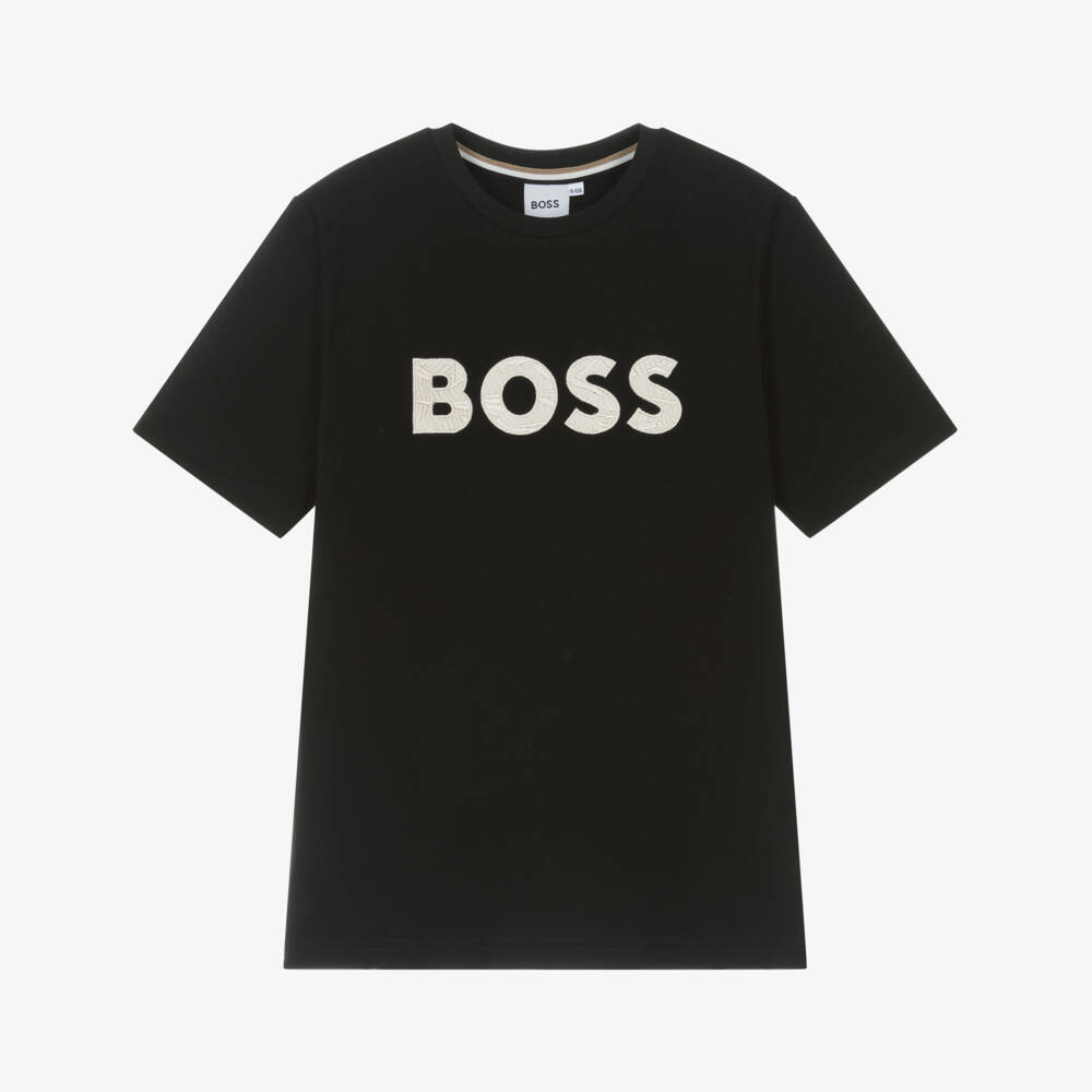 Cool black T-shirt for boys from BOSS, with an embroidered ivory logo across the front. Casual and comfortable, it is made in soft cotton piqué with the brand's striped trim inside the neckline adding a signature finishing touch.