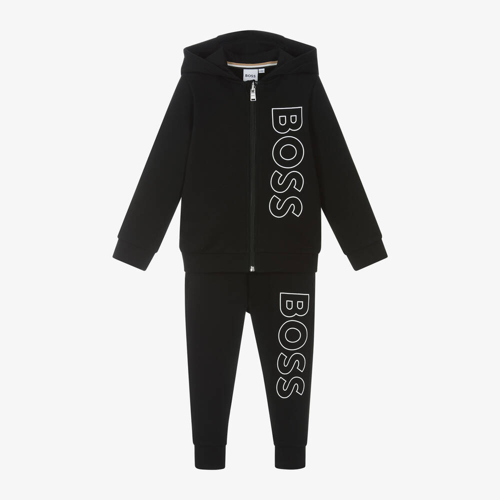 Black tracksuit for boys by BOSS, made in soft, mid-weight cotton jersey with a warm, fleecy inside. Both pieces feature a vertical white logo print on the front for instant brand recognition. The zip-up hooded top has side seam pockets and a useful chin guard at the top of the zip. The joggers also have side seam pockets and have a drawstring waist for a comfortable fit.