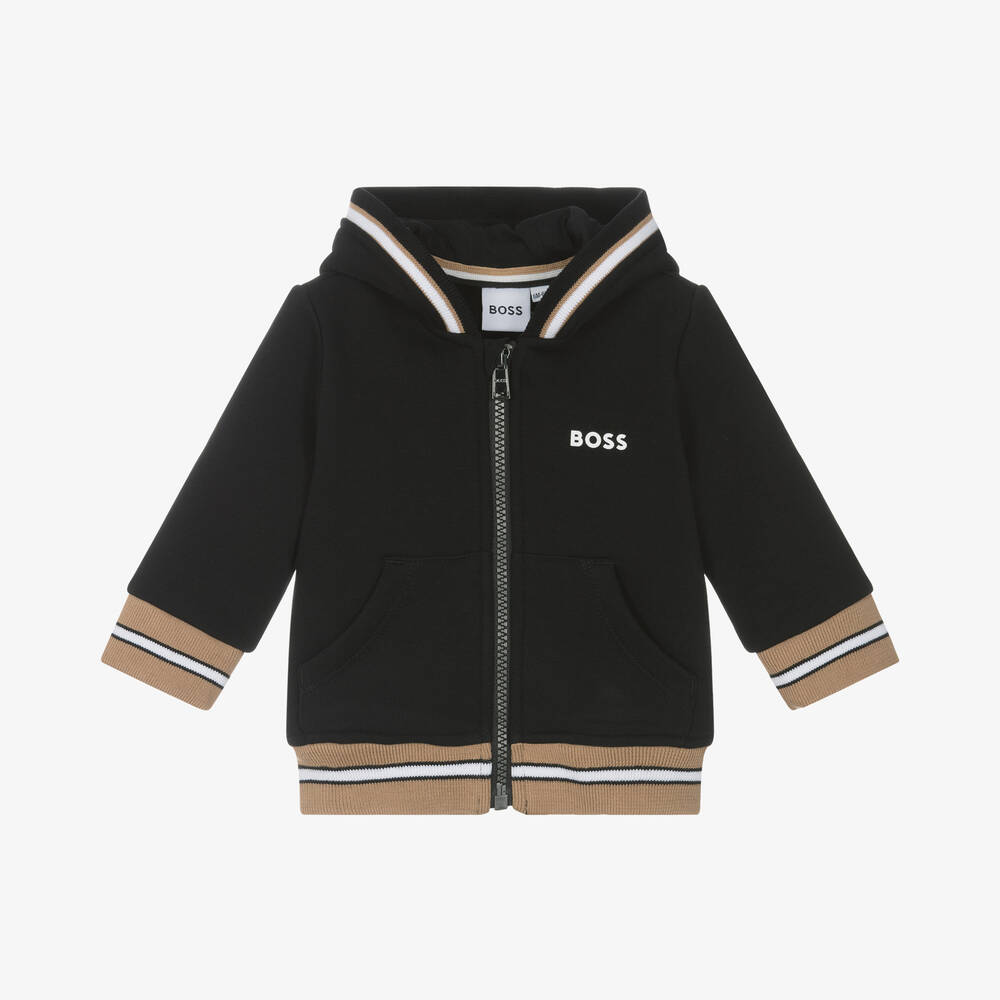 Black zip-up top for little boys by BOSS, made in mid-weight cotton jersey with a warm fleecy inside. Ideal for layering, this long-sleeved top has a front zip fastening and a cosy hood with signature striped trims. There is a white logo print on the chest, front pockets and beige, white and black stripes on the hem and around each cuff to match the hood.
