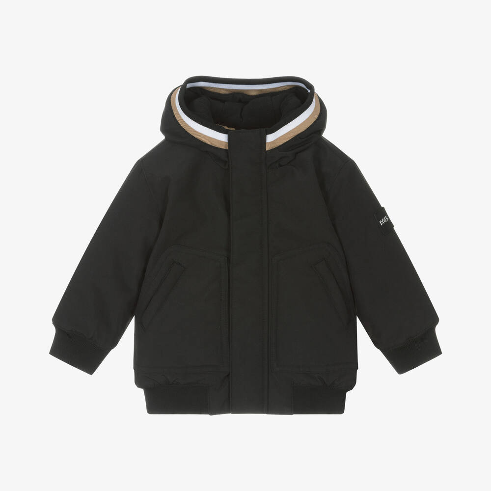 A stylish and practical, black hooded jacket for little boys by BOSS. Warmly padded, it is made in smooth, water-repellent fabric with ribbed cuffs and useful front pockets. This comfortable jacket has the brand's iconic beige, white and black stripes on the hood for a designer touch. It fastens with a zip beneath a storm flap that secures with velcro to help protect your little one from the elements.