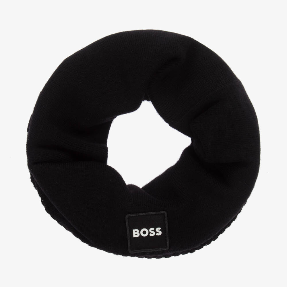 A black snood for boys by BOSS, in a super soft knit with a hint of wool. It has the signature bold black and white rubberised logo on the front for a branded look. The lining is made from cosy polar fleece, designed to keep them warm in the coldest weather.