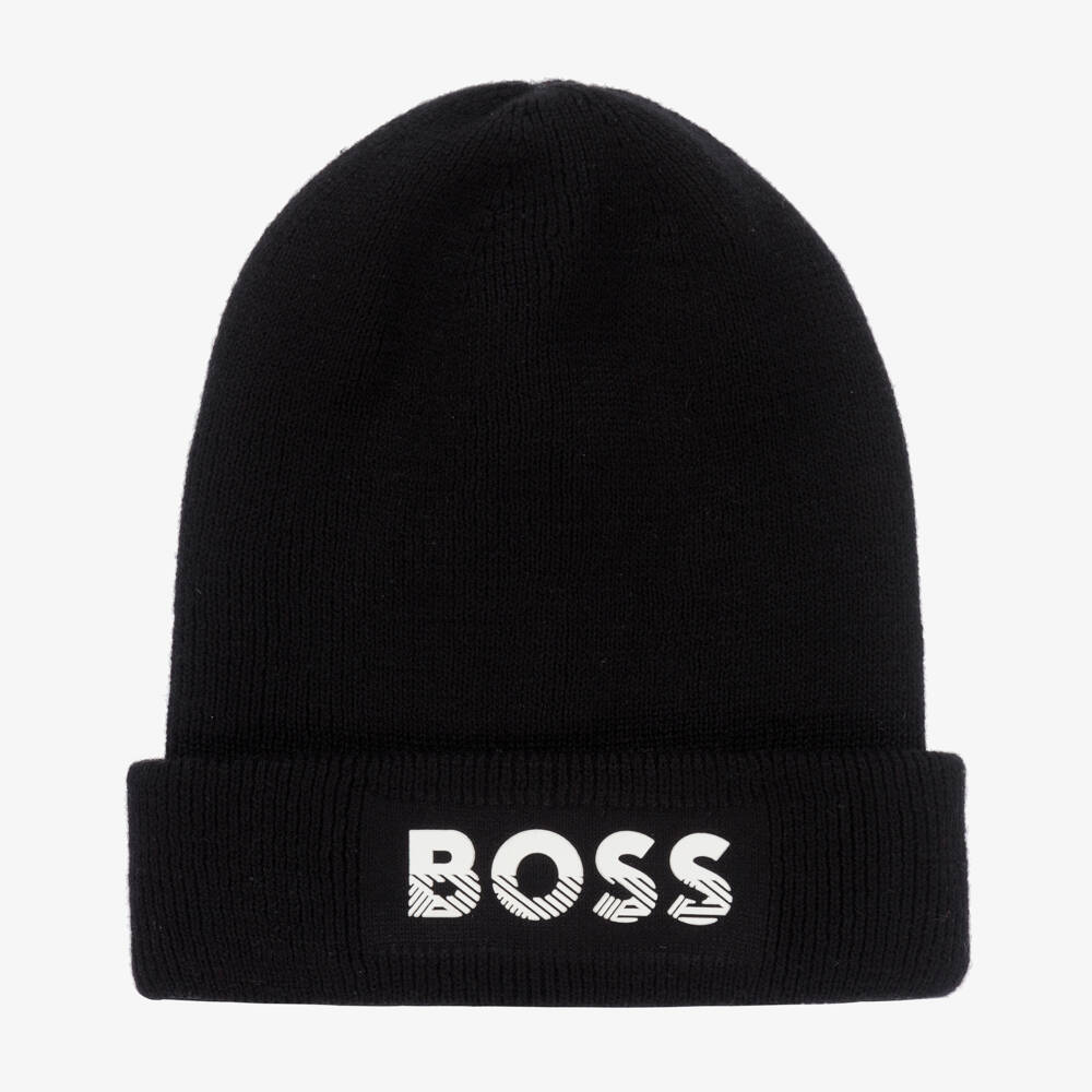 Black knitted beanie hat for boys by BOSS. It is made in a cosy double layer with a white rubberised logo on the brim.