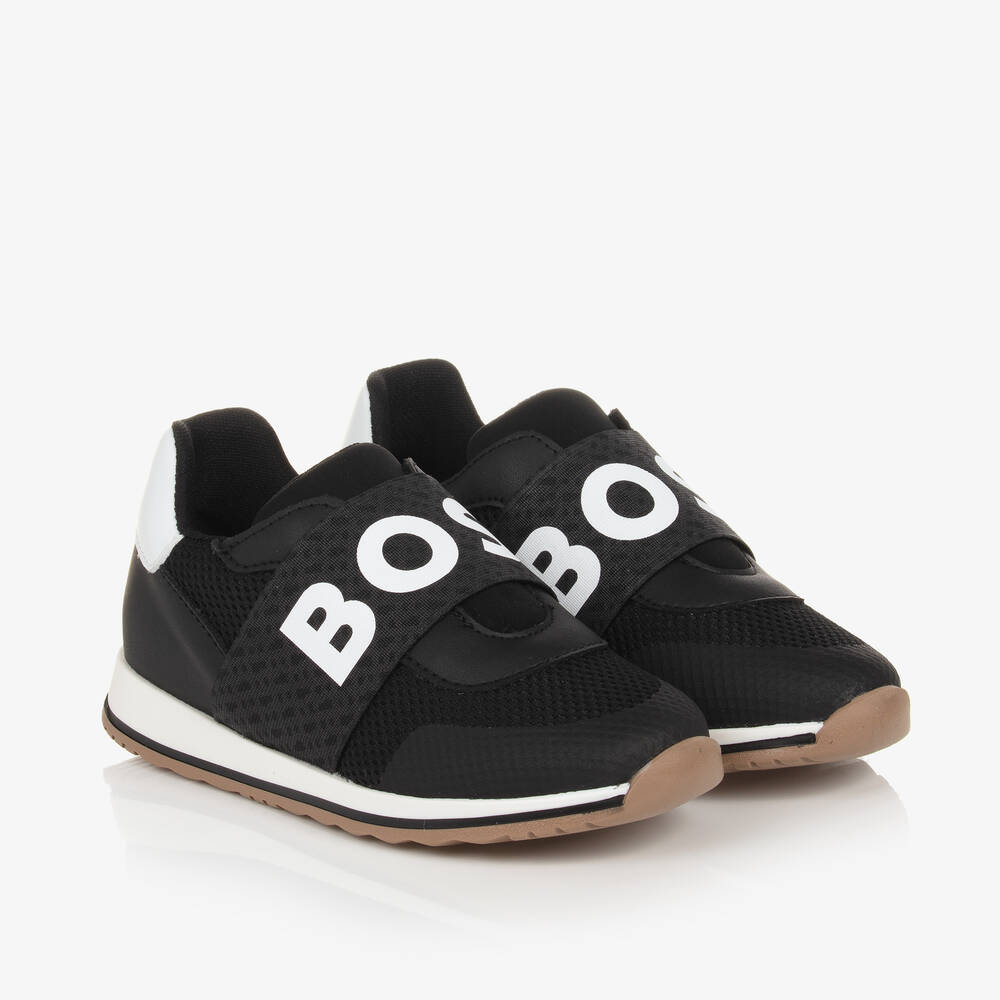Black trainers for boys by BOSS, made in mesh with leather trims. Cool and casual, these sneakers are printed with BOSS logos for a stand-out look. They slip on easily over the foot thanks to the elasticated front strap and have a comfortably padded textile lining. They are complete with a smooth faux leather insole and a chunky rubber outsole in the brand's signature tricolours.