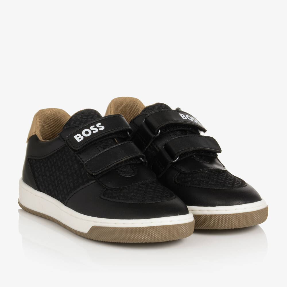 Cool and casual, these black faux leather trainers for boys are from BOSS. They have a textile monogram logo design, with a white logo across the velcro strap and beige trim. The lining is made from soft textile, with a faux leather insole and a non-slip rubber outsole for added comfort.