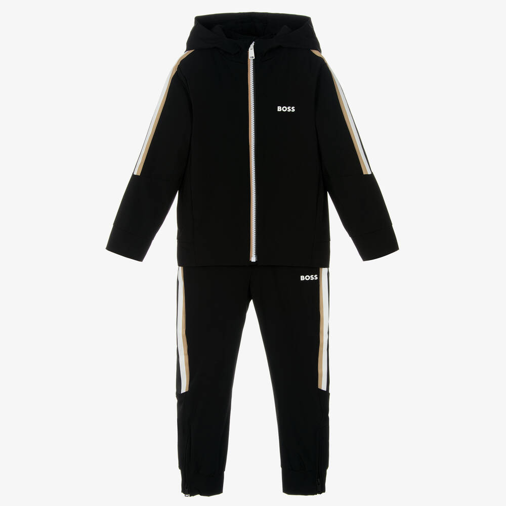 A black Mini-me hooded tracksuit for boys by BOSS, in a sleek and sporty, logo-inspired style. Part of the Matteo Berrettini capsule, this regular fit, activewear outfit has a white logo printed on the jacket, with the brand's signature taped detailing on the front zip, sleeves and legs. Both pieces are lined in comfortable, cotton jersey, with concealed pockets on the jacket and slanted front pockets on the joggers. The joggers have an internal drawstring waist for a good fit and cosy, zip-up ankle cuffs.