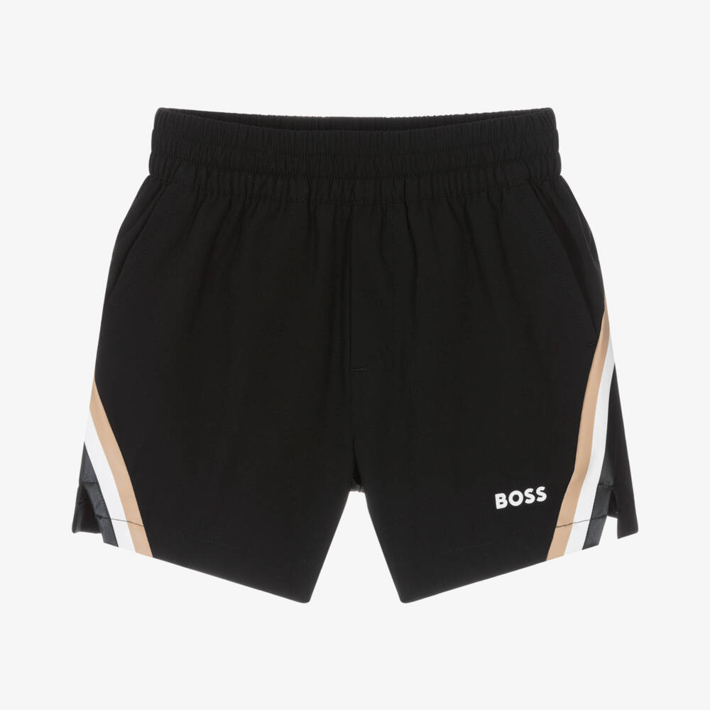 Part of the Matteo Berrettini collection, these casual black shorts for boys by BOSS are trimmed with the brand's signature striped design. There is a white rubberised logo near the hem and discreet side seam pockets on the front. Smooth and lightweight, they have an internal drawstring in the elasticated waist for comfort and small slits in the hemline for ease of movement.