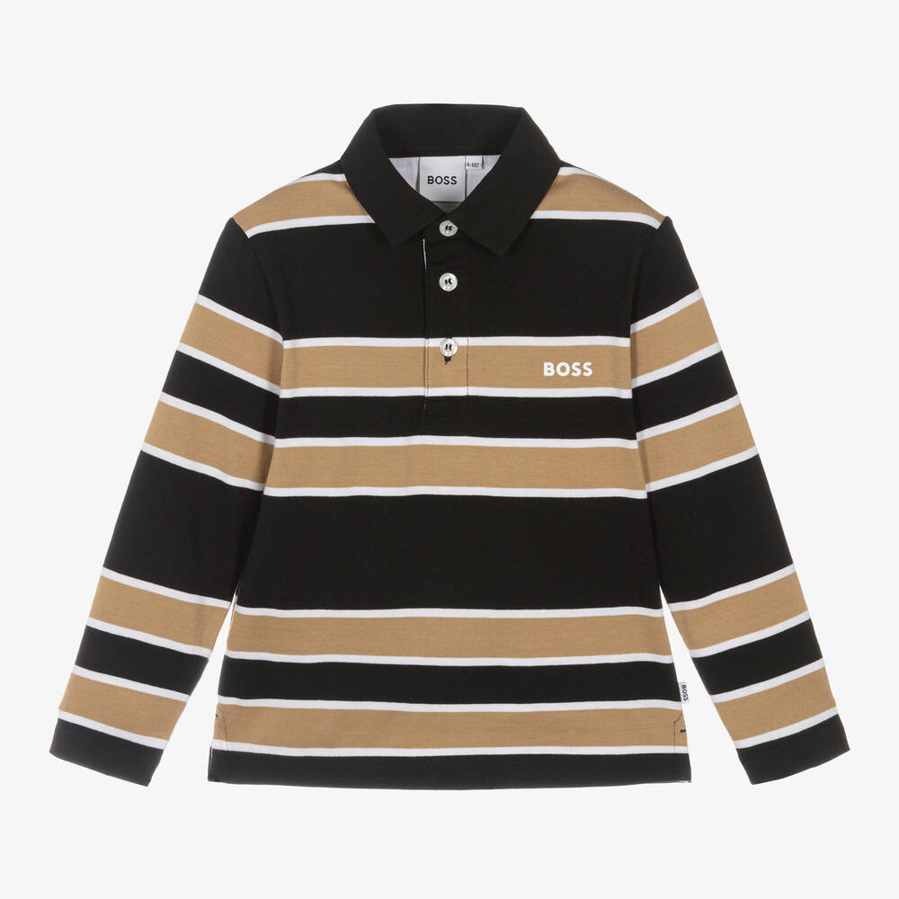 Striped in black, white and beige, this long-sleeved polo shirt for boys is designed by BOSS. Made in soft cotton jersey for comfortable wear, this casual top has a white logo stamped on the chest, branded button fastenings and a sporty split hem.