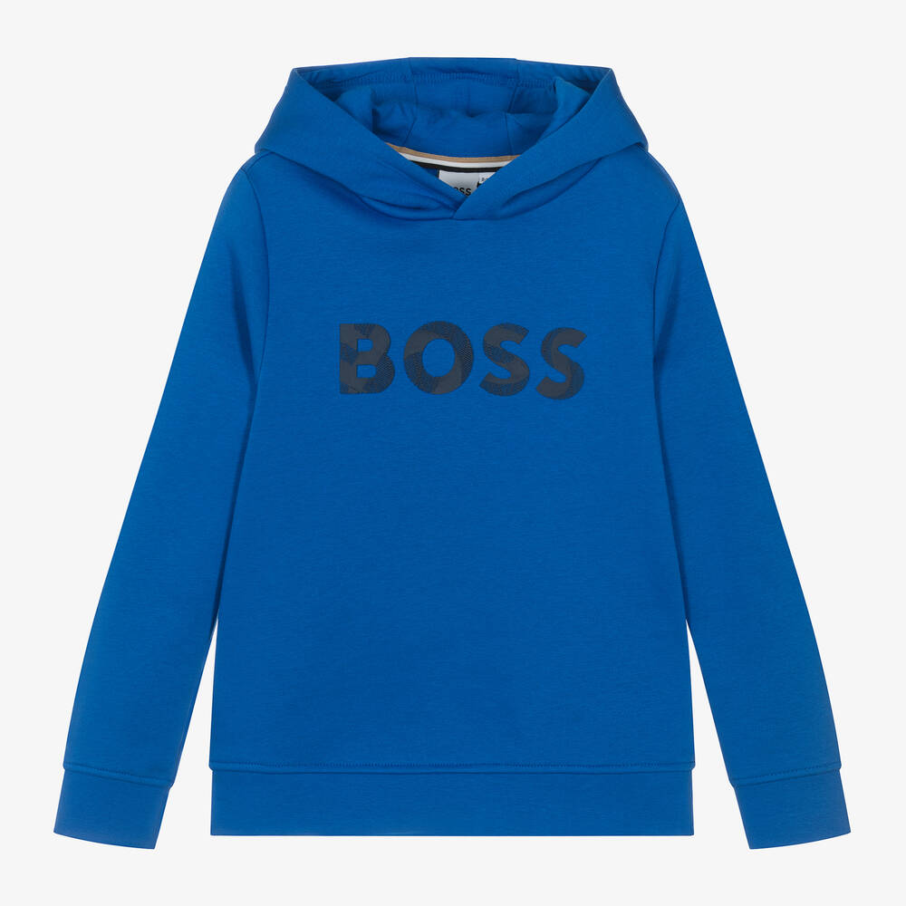 Vibrant blue hooded sweatshirt for boys by BOSS, with a rubberised logo print on the chest for instant designer appeal. Comfortable and casual, this long-sleeved top is made in soft, mid-weight cotton jersey with cosy ribbed trims.