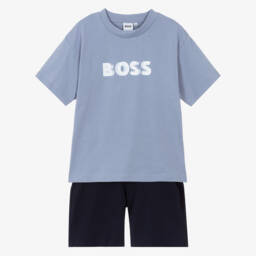 Casual blue cotton shorts set for boys by BOSS, made in soft, comfortable jersey. The light blue T-shirt features a bold logo printed on the front in white and blue, whilst the navy blue Bermuda shorts have a logo tab on the comfortable elasticated waistband. Easy to wear, the set simply pulls on.