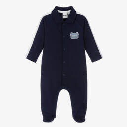 Navy blue cotton babygrow for baby boys by BOSS, made in soft comfortable jersey. It is styled with a classic polo collar and sporty white sleeve stripes, and fastens with easy-to-use poppers on the front and between the legs. For instant brand appeal, there is a rubberised red panda logo patch on the chest.