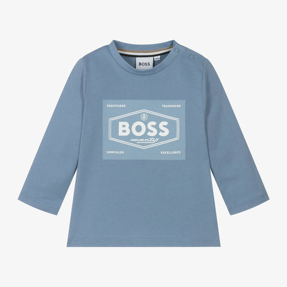 A blue long-sleeved top for little boys by BOSS, made in soft cotton jersey. Fastening with poppers on one shoulder, this casual style has The Original BOSS 1977 logo on the front. The neckline is lightly ribbed for comfortable, easy dressing.