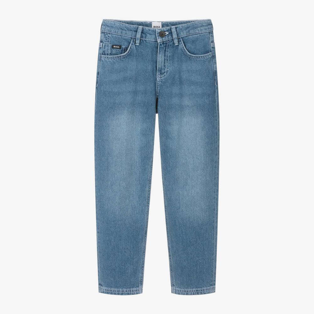 Boys washed blue jeans by BOSS, with a worn look and black branded detailing for instant designer appeal. Made in soft, non-stretch denim in a classic five pocket style, they have a comfortable loose fit. Smaller sizes have an adjustable waist for a great fit.