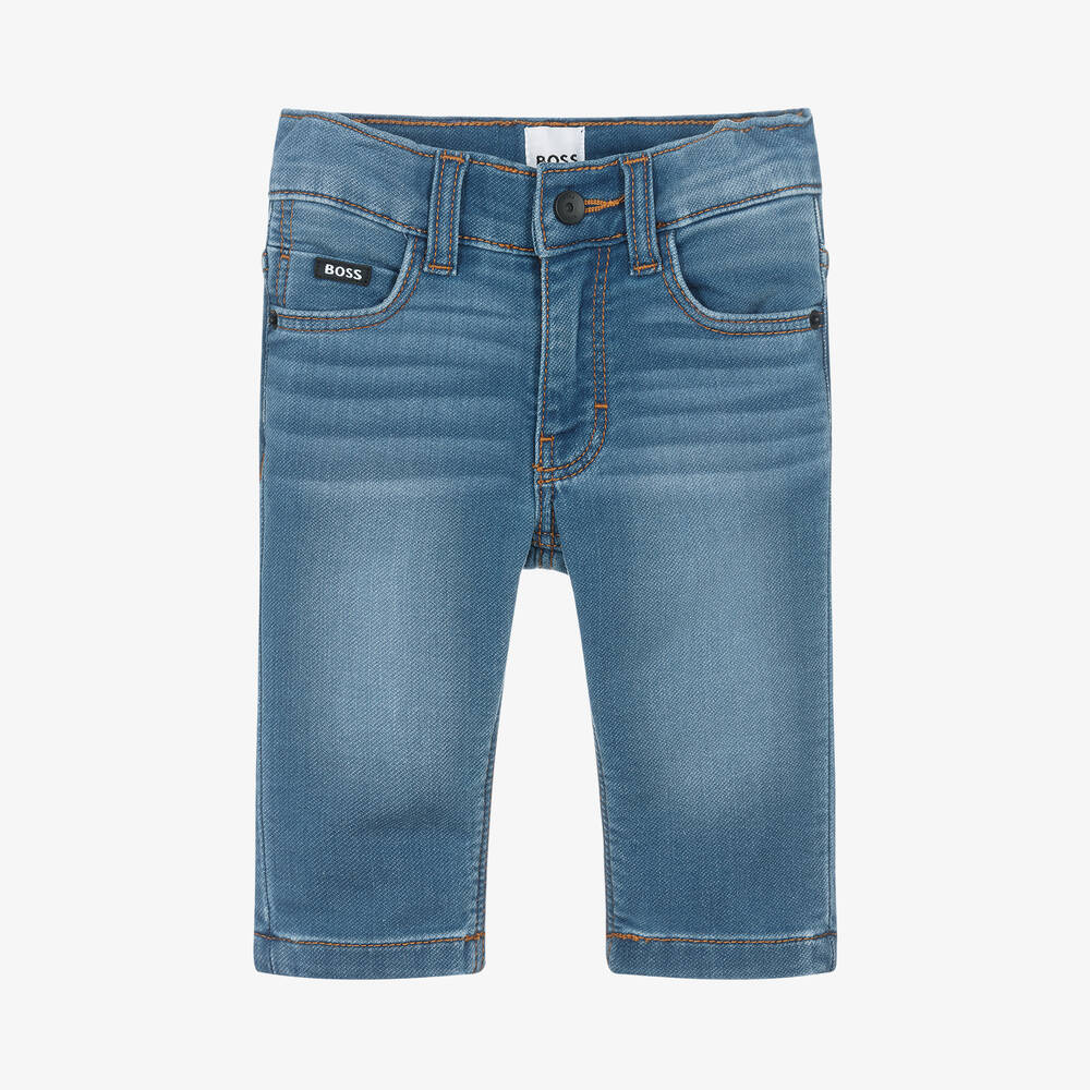 In a mid-blue wash, these stylish jeans for younger boys by BOSS are made in soft cotton-blend denim, with a hint of stretch. Designed in a regular fit, they have classic five-pocket styling, with a small logo tab on the front and a branded jacron on the back. They fasten with a hook and zip and have an adjustable waistband to ensure a comfortable fit.