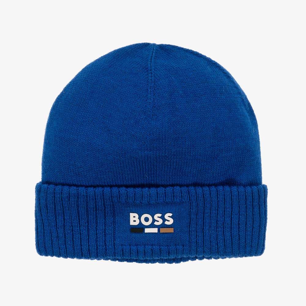 Blue Mini-me beanie hat for little boys by BOSS, softly knitted with a touch of wool. This cosy hat has a ribbed, turned-up brim and a rubberised logo design on the front for a branded look.