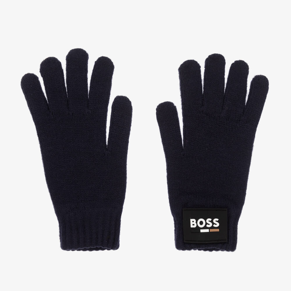 Navy blue gloves for boys by BOSS, knitted in a soft cotton and wool blend. Ideal for providing lightweight warmth, these stretchy gloves have comfortable ribbed cuffs. For unmistakable designer appeal, one glove has a rubberised logo patch on the wrist.