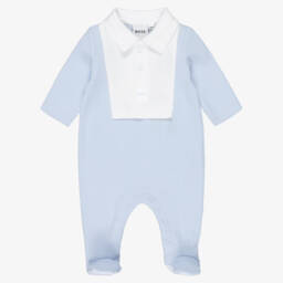 Pale blue hat for little boys by BOSS. Finely knitted in soft cotton, it is lined in super soft plush velour to help keep little ones warm on chilly days. It has white stripe detailing and an embroidered logo in navy blue and white. There are knitted ribbed ear flaps for extra warmth and a cute navy blue pom-pom on the top.