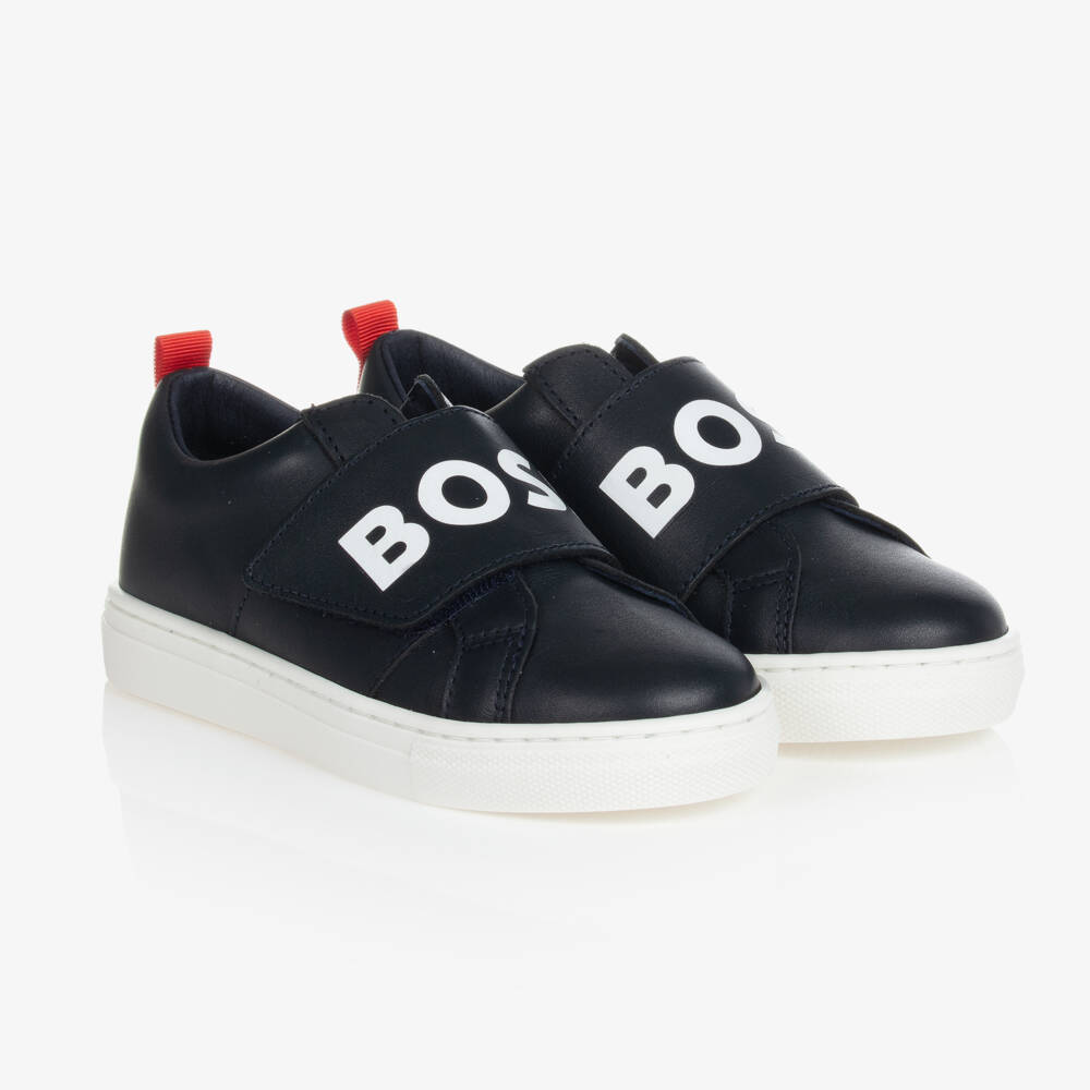 Unmistakably BOSS, these navy blue leather trainers for boys are cool and comfortable. The useful velcro strap has a striking white logo print, whilst the red heel tab adds vibrancy to this easy, pull-on style. A discreet embossed motif is featured on the tongue. These shoes have a soft textile insole, and a non-slip rubber outsole.