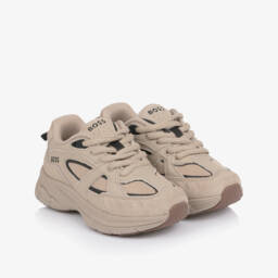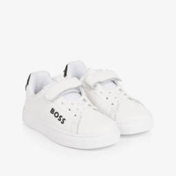 Navy blue trainers for boys by BOSS, with soft leather and mesh uppers. Designed with bright blue trims, these sporty slip-on trainers have an elasticated strap across the foot, highlighted with an unmistakable logo print. Further branding can also be seen on the heel. They have a soft mesh lining and a comfortably padded faux leather insole. The non-slip rubber outer soles provide a better grip on slippery surfaces.