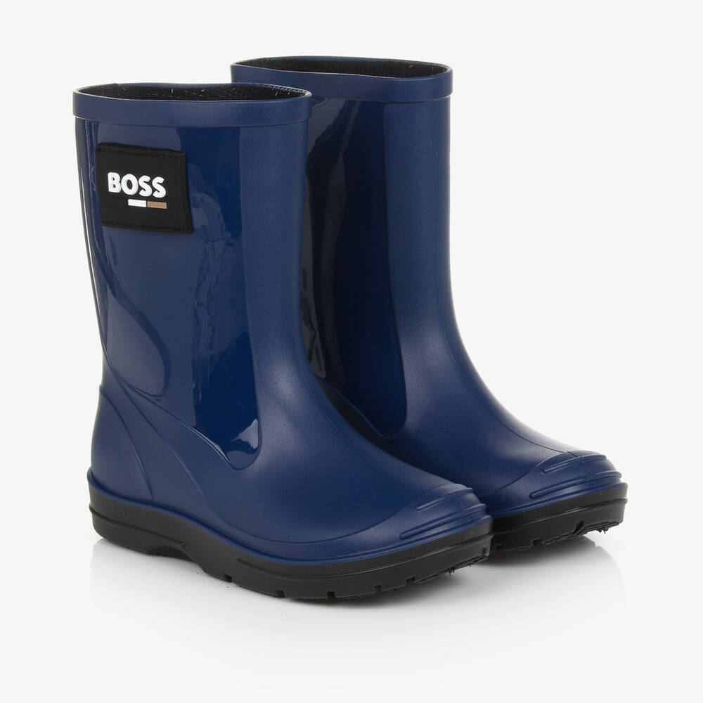 Blue rain boots for boys by BOSS, made from flexible rubber with glossy side panels. Ideal for wet and rainy days, they have the brand's logo in white on one side, with signature stripe detailing below for instant designer appeal. A soft textile lining and lightly cushioned insole provides comfort and the non-slip rubber outer sole improves grip on slippery surfaces.
