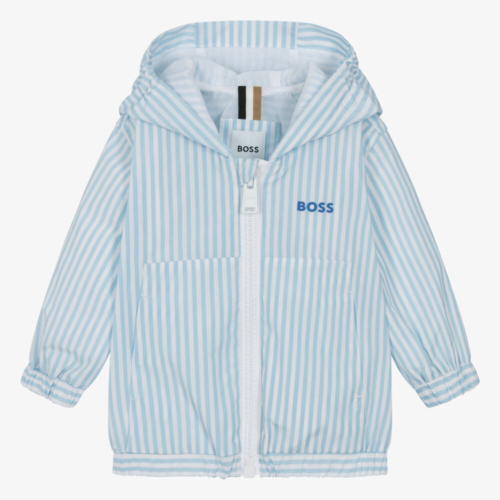A lovely pale blue and white striped windbreaker jacket for little boys by BOSS. Smooth and lightweight, this hooded jacket has a zip fastening and protective chin guard on the front. Lined in soft mesh, it has discreet pockets and elasticated cuffs and hem for extra comfort. There is a bold blue logo printed on the chest and a striped trim on the back of the neck for a signature finish.