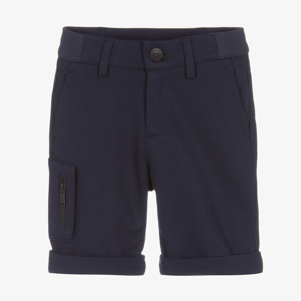 Classic with a modern twist, these navy blue Bermuda shorts for boys are by BOSS. In a relaxed cargo style, these viscose shorts feature four-pocket styling, with a zip-up pocket on the side. They fasten with a zip and popper, and have turn-up hems. The brand's logo is printed with signature detailing on the back. All sizes have an adjustable, elasticated waistband.