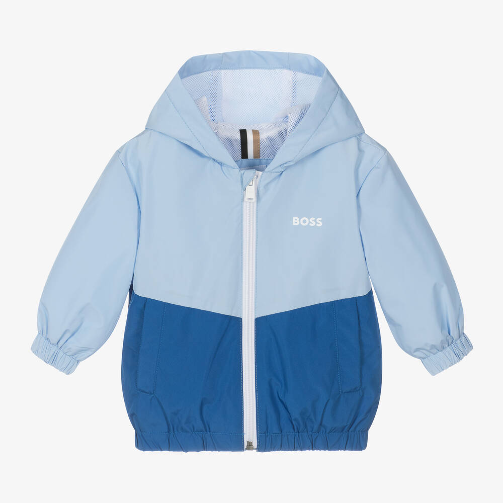 A blue colourblock windbreaker jacket for little boys by BOSS, printed with a white logo on the chest. Smooth and water repellent, this hooded jacket has slanted pockets on the front and elasticated cuffs and hem for a comfortable fit. It is lined in lightweight mesh, with a zip fastening and protective chin guard.