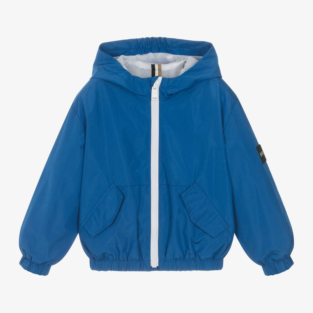 Silky smooth and water repellent, this bright blue hooded windbreaker for boys is by BOSS. Comfortable to wear, it has a breathable mesh lining, with an elasticated hem and cuffs to help keep out chilly winds. The jacket fastens with exposed white zip on the front and has popper-securing flap pockets. For a subtle designer finish, there is signature tri-colour striped trim on the inside neck, with a black rubberised logo patch on one sleeve.