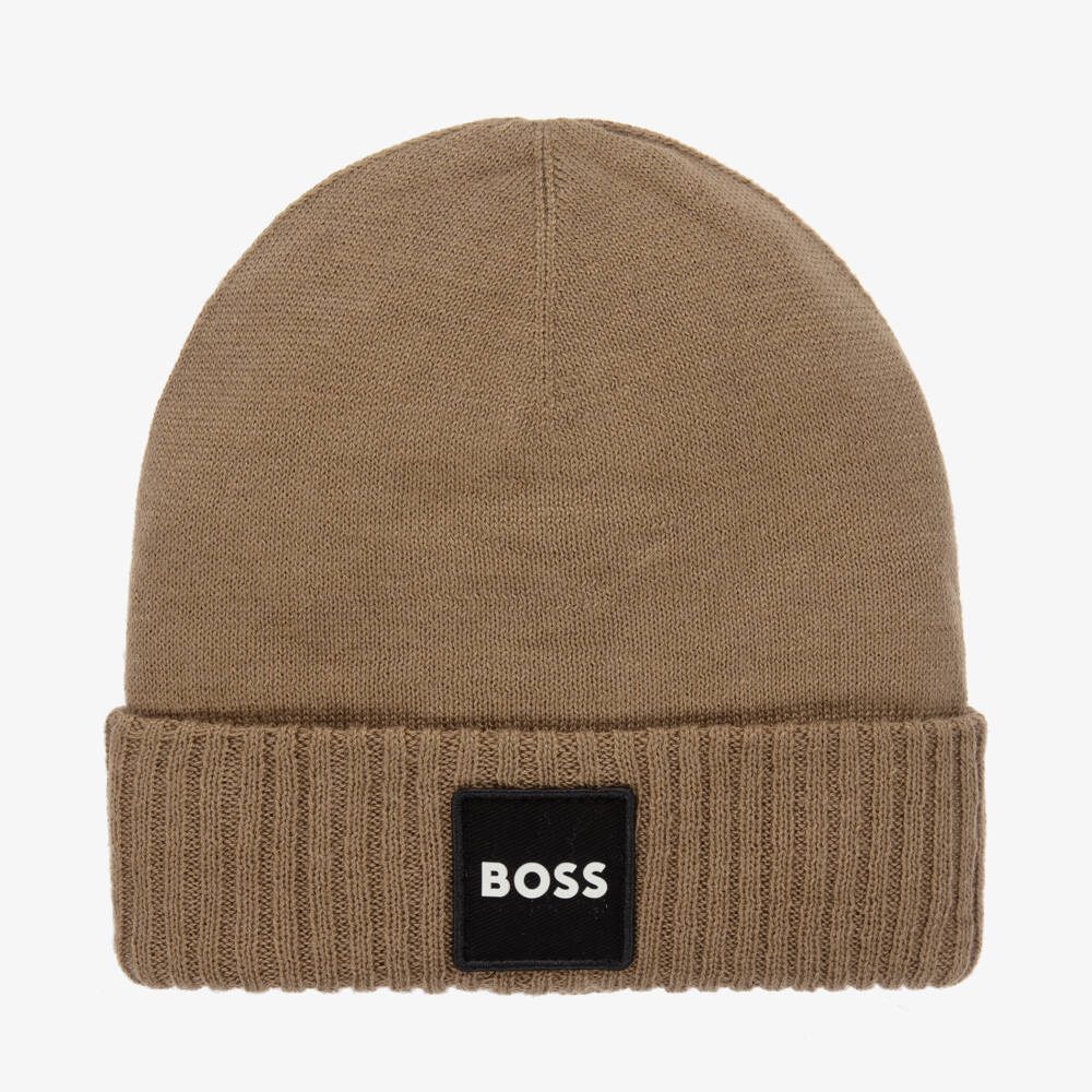 Dark beige beanie hat for boys by BOSS, made in a softly knitted double layer with a touch of wool for extra warmth. This cosy hat has a ribbed, turned-up brim and a black patch on the front with a white rubberised logo.