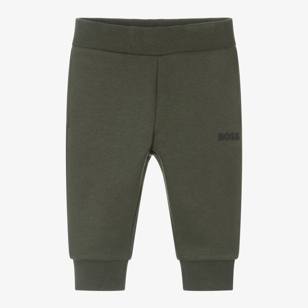 Casual khaki green joggers for little boys by BOSS. Made in soft cotton jersey for all-day comfort, these cuffed joggers have a black rubberised logo on one leg. There is an elasticated waistband, with useful pockets on the side seams.