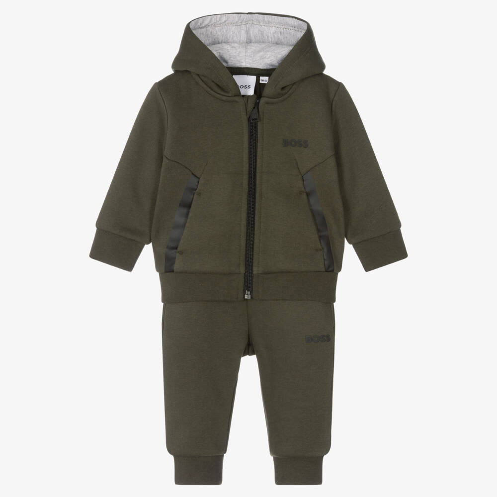Khaki green tracksuit for little boys by BOSS. It is made in soft cotton sweatshirt jersey for comfortable, warm wear. Both pieces have raised black logo prints, black trims and pockets. The hooded top fastens with a front zip and the trousers have an elasticated waistband.
