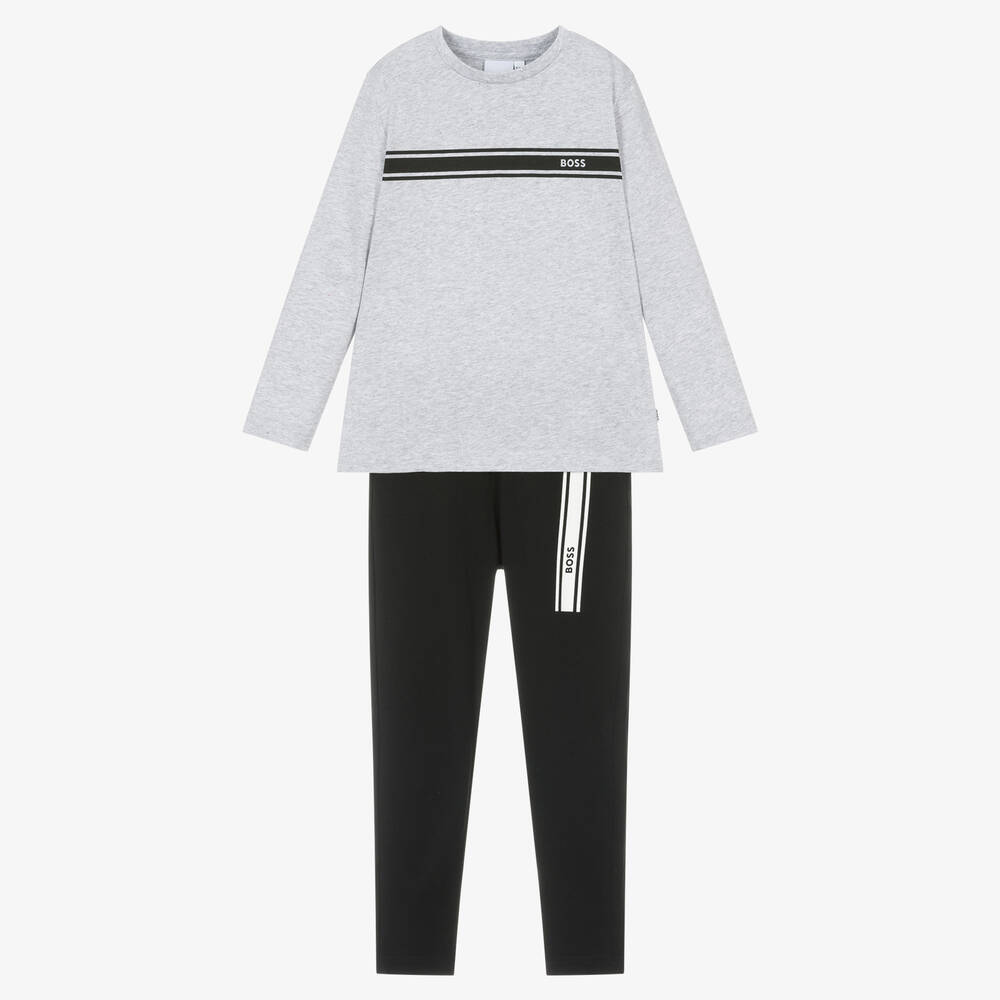 Grey marl and black pyjamas for boys by BOSS, made in soft cotton jersey for a comfortable night's sleep. Each piece is printed with a striped logo motif in black or white, with branded tabs on the side seams for a signature designer look. The trousers have a gently elasticated waistband and the set comes in a branded storage pouch, ideal for travelling.