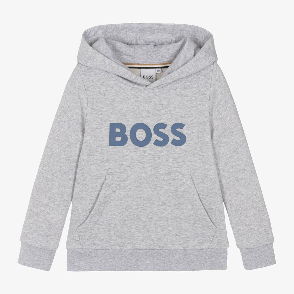 Grey marl Mini-me hoodie for boys by BOSS, made in soft, mid-weight cotton jersey with a warm, fleecy inside. Ideal for layering on cooler days, this casual top has a bold blue logo printed across the front for instant brand recognition. There is a pouch pocket on the front and for added designer appeal, the brand's signature trim features inside the neck.