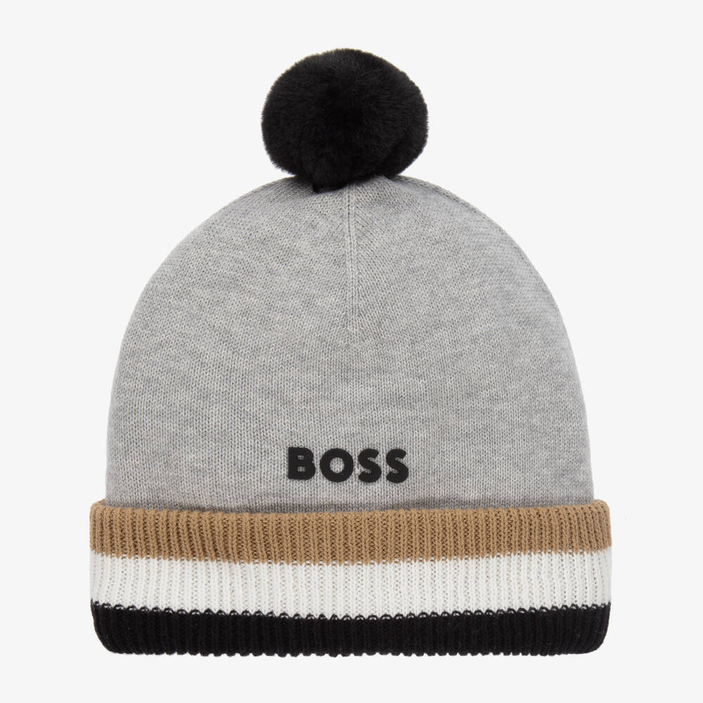 Light grey bobble hat for little boys by BOSS, knitted in soft cotton. This cosy hat has a polar fleece lining for extra warmth and a turned-up ribbed brim with beige, white and black stripes. It has a black plush pom-pom on the top and a black rubberised logo on the front for a subtle designer finish.