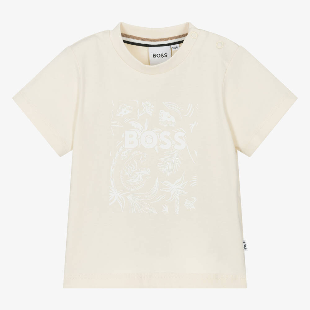 An ivory T-shirt for little boys by BOSS, made in soft cotton jersey. A great addition to a designer wardrobe, it has a white print on the front with tropical motifs and the brand name.